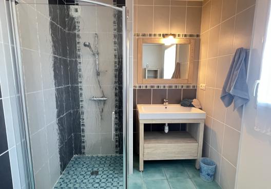- Salle d'eau avec douche à l'italienne, vasque sur meuble et meuble colonne