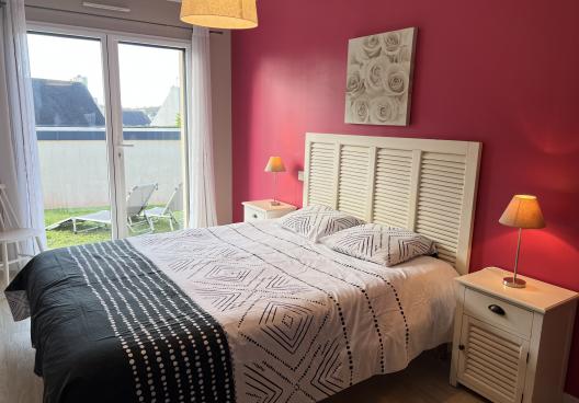 - Chambre 1 : un lit de 160 avec couette et couverture, ouvrant par une baie vitrée sur une terrasse exposée sud