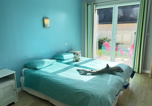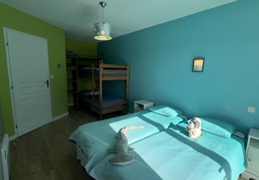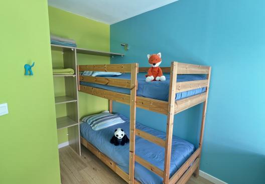 - Chambre 2 : deux lits de 80 (superposés) et deux lits de 90 avec couettes et couvertures, baie vitrée donnant sur la terrasse