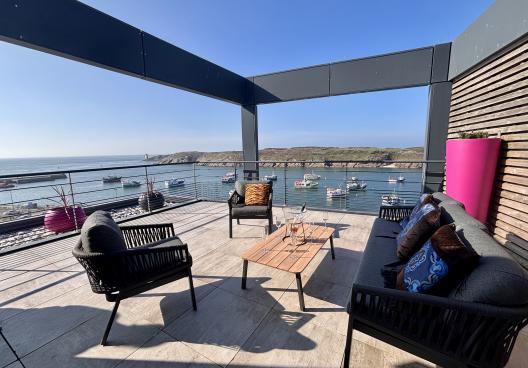 - Une grande terrasse aménagée avec un grand salon de jardin, parasol et transats. Extension naturelle du salon, c'est le point d'observation idéal pour le coucher du soleil sur les îles.