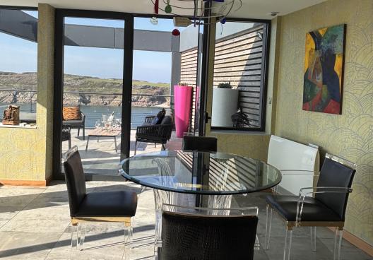 Située dans un environnement privilégié et exceptionnel au Conquet, cette vaste propriété de 365 m² privilégie avant tout l'espace, la lumière et la douceur de vivre face à l'océan. C'est une demeure de vacances authentique et généreuse, offrant une vue imprenable sur le port de pêche, le phare de Kermorvan et les îles de la mer d'Iroise. Sa configuration sur trois niveaux en fait un lieu de séjour idéal et parfaitement fonctionnel pour les familles ou groupes d'amis jusqu'à 8 personnes.