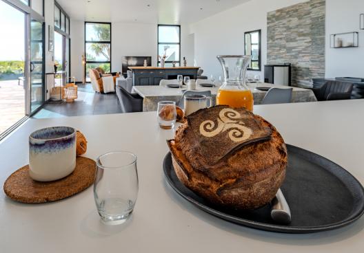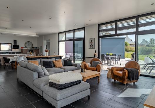 Baigné de lumière grâce à ses grandes baies vitrées, l’espace de vie spacieux s'ouvre sur une