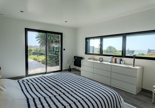 dispose d'un lit de 160 cm, de grandes fenêtres avec vue mer, et d'une vaste salle de bain